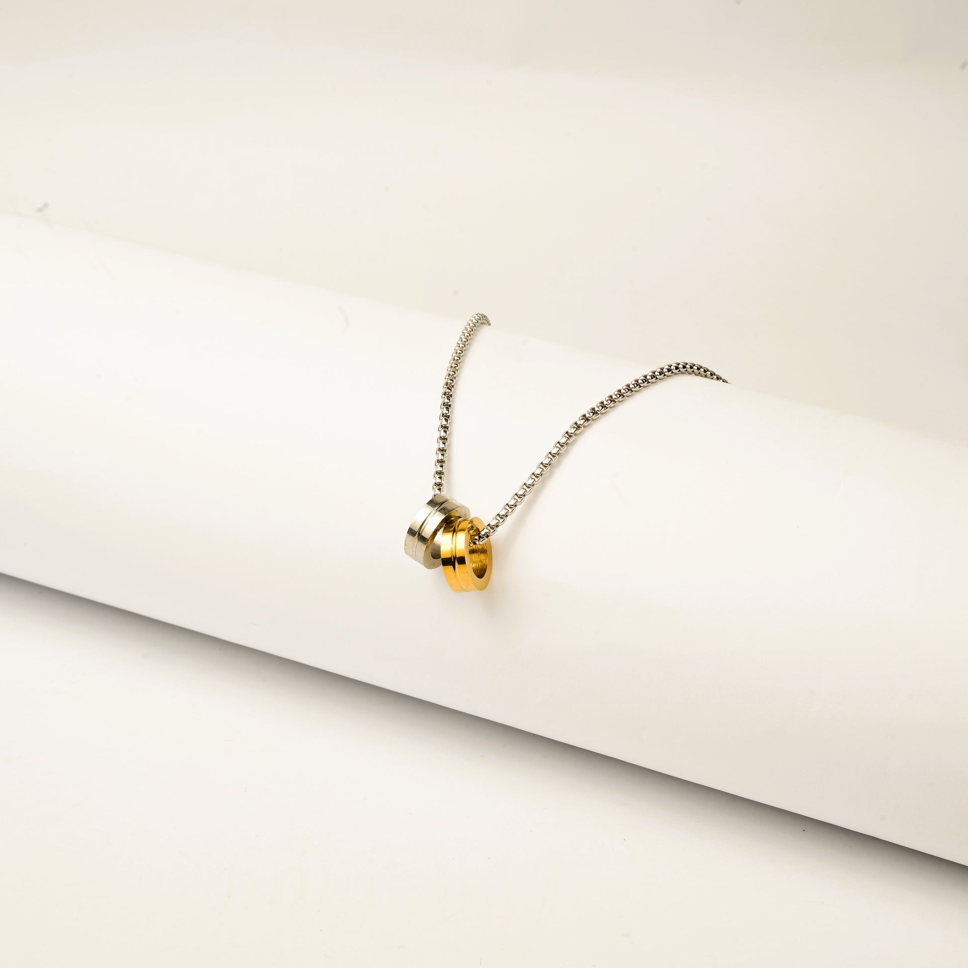 Make a bold yet refined statement with the Dual-Tone Ring Pendant Necklace from Chained & Co., where minimalism meets distinction. Featuring two interlocking rings in contrasting silver and gold tones, this piece symbolizes balance, unity, and strength.